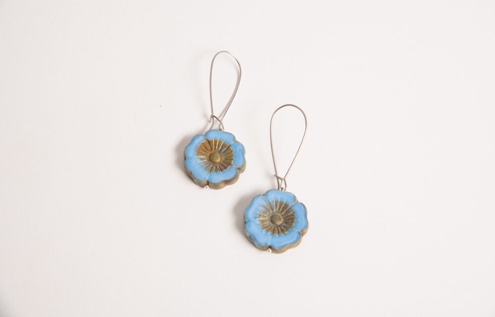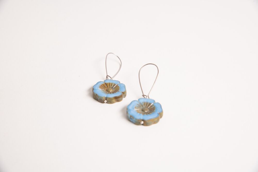 Helesinisest klaasist lillemotiividega 22mm kõrvarõngad, pikk haak