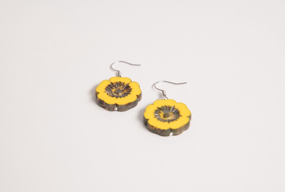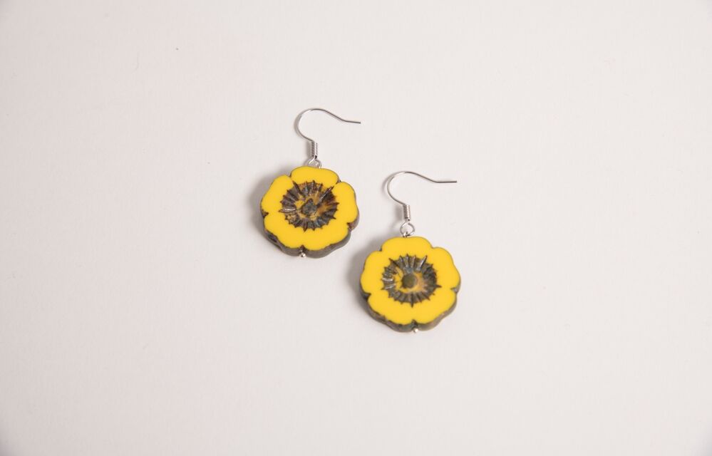 Kollasest klaasist lillemotiividega 22mm kõrvarõngad, lühike haak
