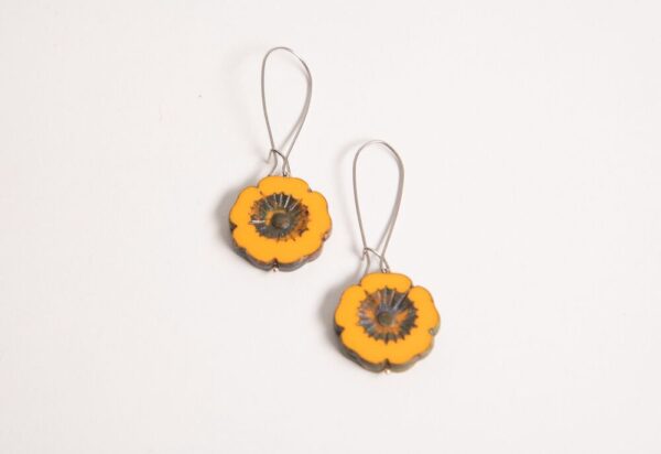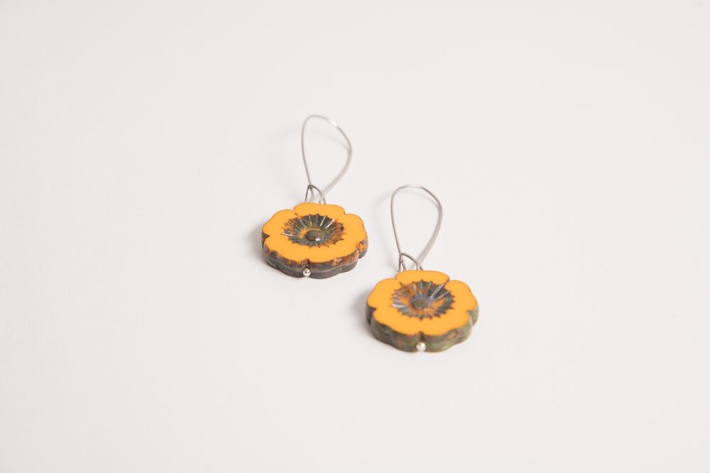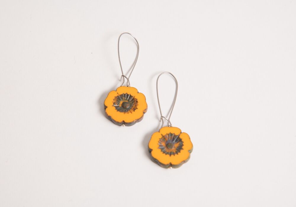 Oranžist klaasist lillemotiividega 22 mm kõrvarõngad, pikk haak