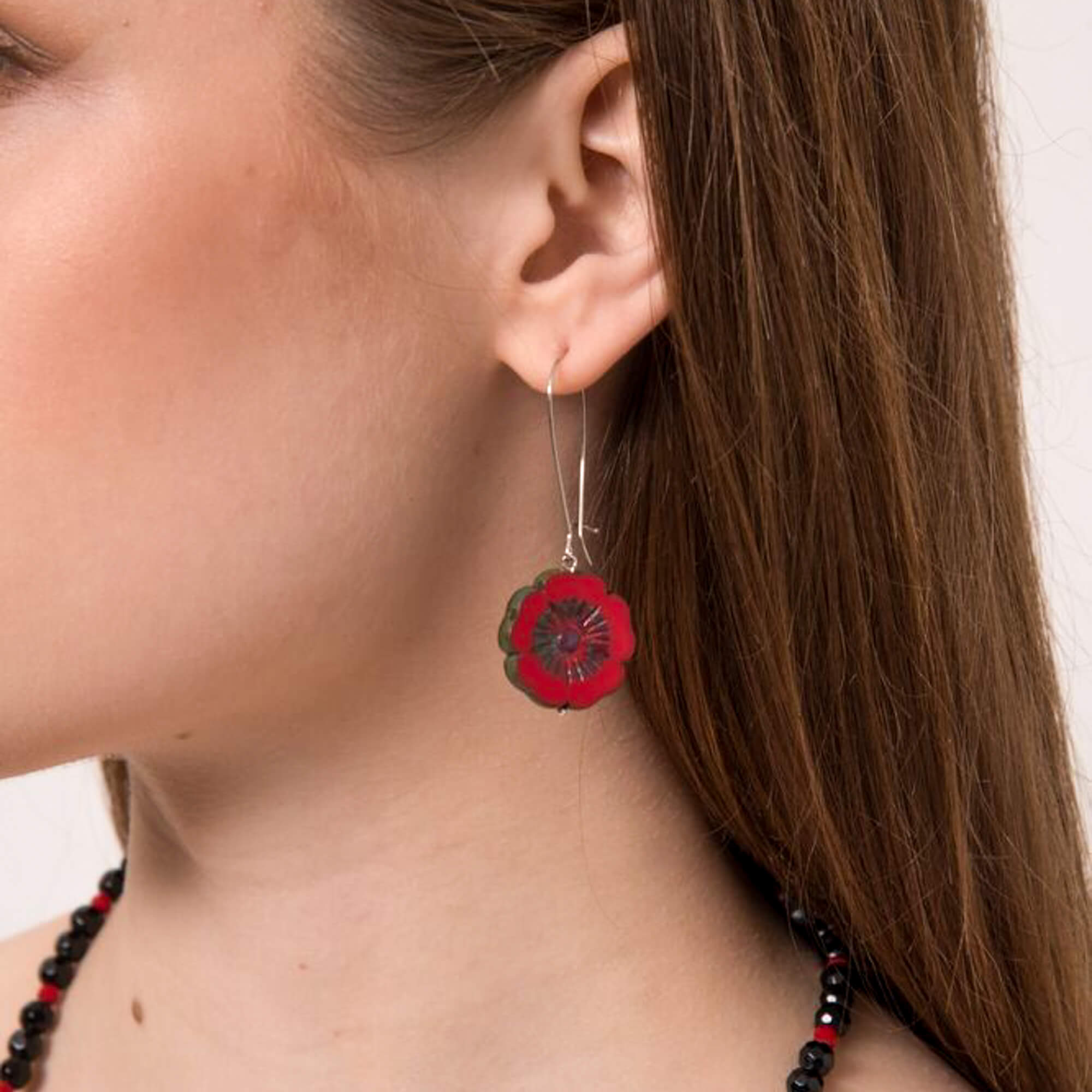 Punasest klaasist lillemotiividega 22mm kõrvarõngad, pikk haak