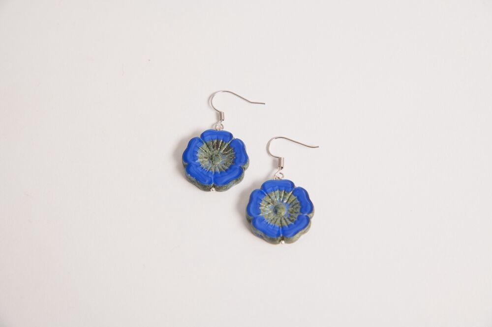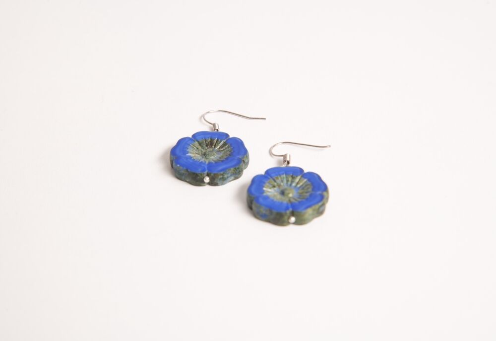 Sinisest klaasist lillemotiividega 22mm kõrvarõngad, lühike haak