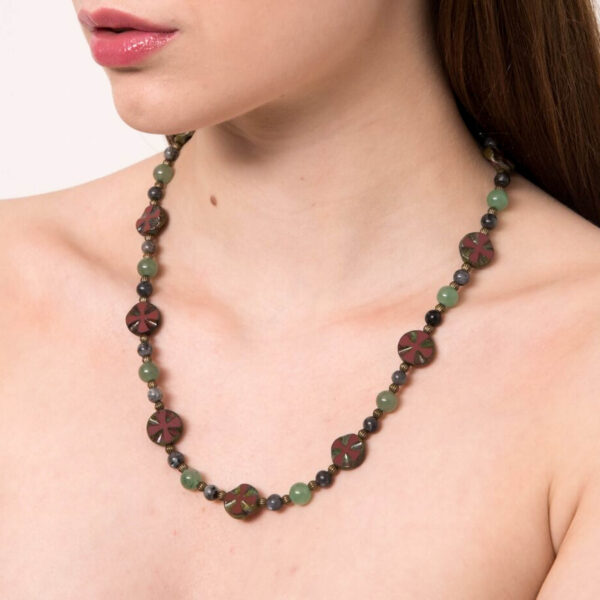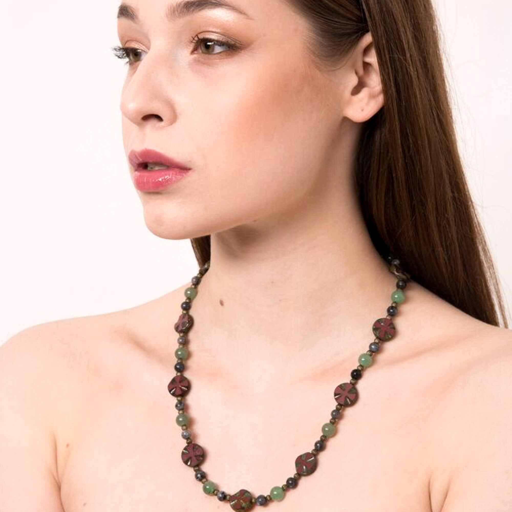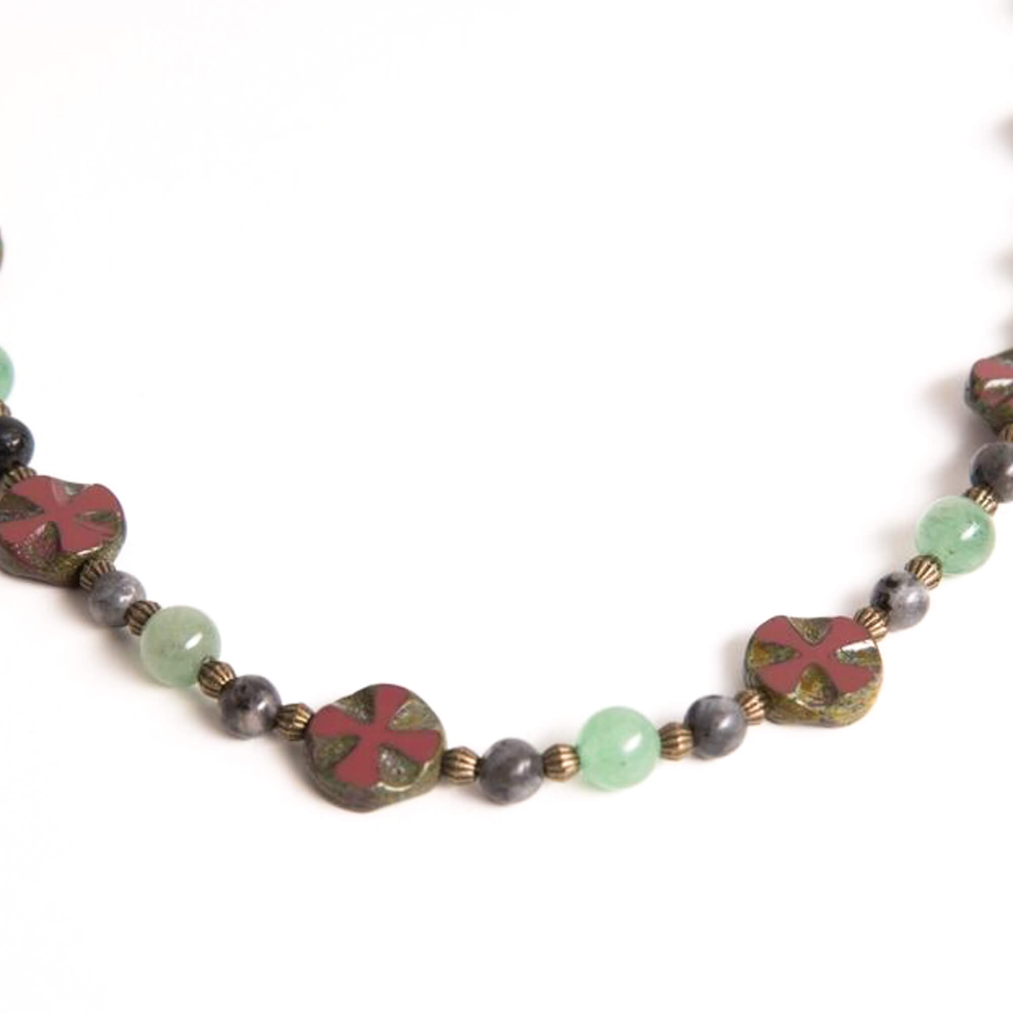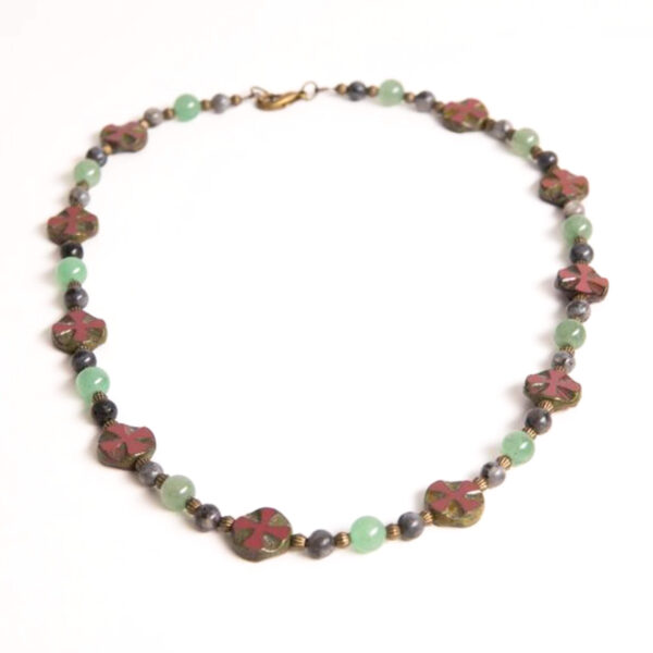 lisavad ehtele värvi ja elujõudu. Naturaalsed materjalid annavad kaelakeele erilise energia ja võlu. Aventuriin on õnnekivi, mis toob rahu ja tasakaalu. Labradoriit on müstiline kivi, mis sümboliseerib muutusi ja uusi alguseid. Kaelahelmed on rohkem kui lihtsalt ehe – see on looduse ja kunsti ühendus. Punased ristid sümboliseerivad nii kaitset kui ka elu.