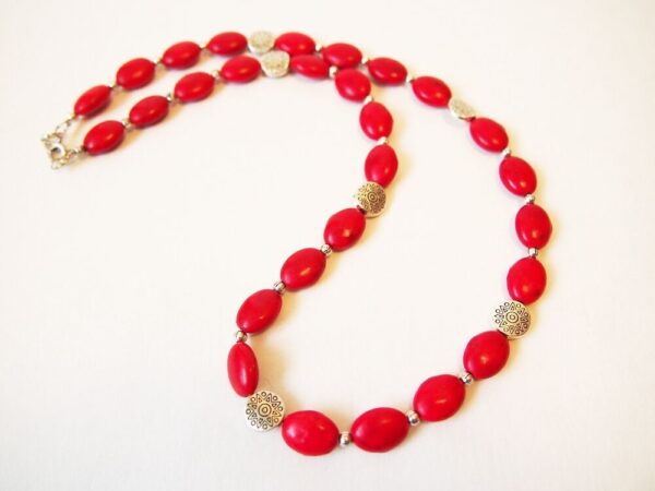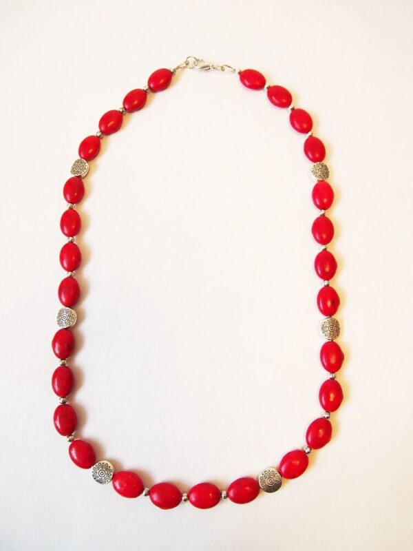 Etno stiilis punasest hauliidist kaelaehe. Käeehte keskmes on kaheksakand ehk Muhu mänd – iidne märk, mida tuntakse ka tänapäeval, kui õnne ja kaitse märki. Metallelelmendid on valmistatud hõbetatud vasesulamist. Niklivaba.Võivad esineda värvivariatsioonid. |