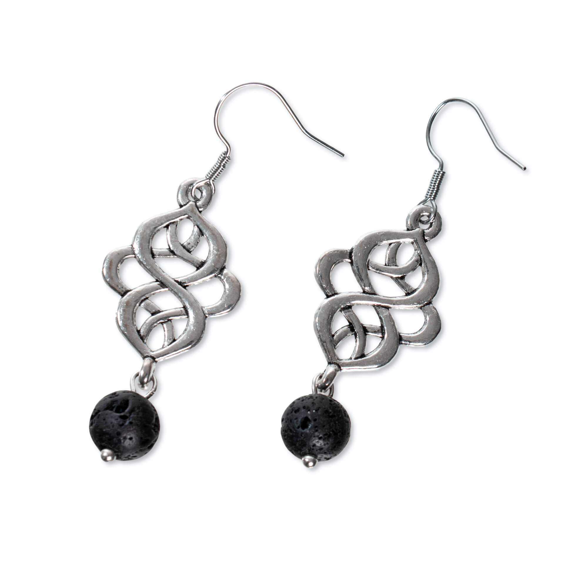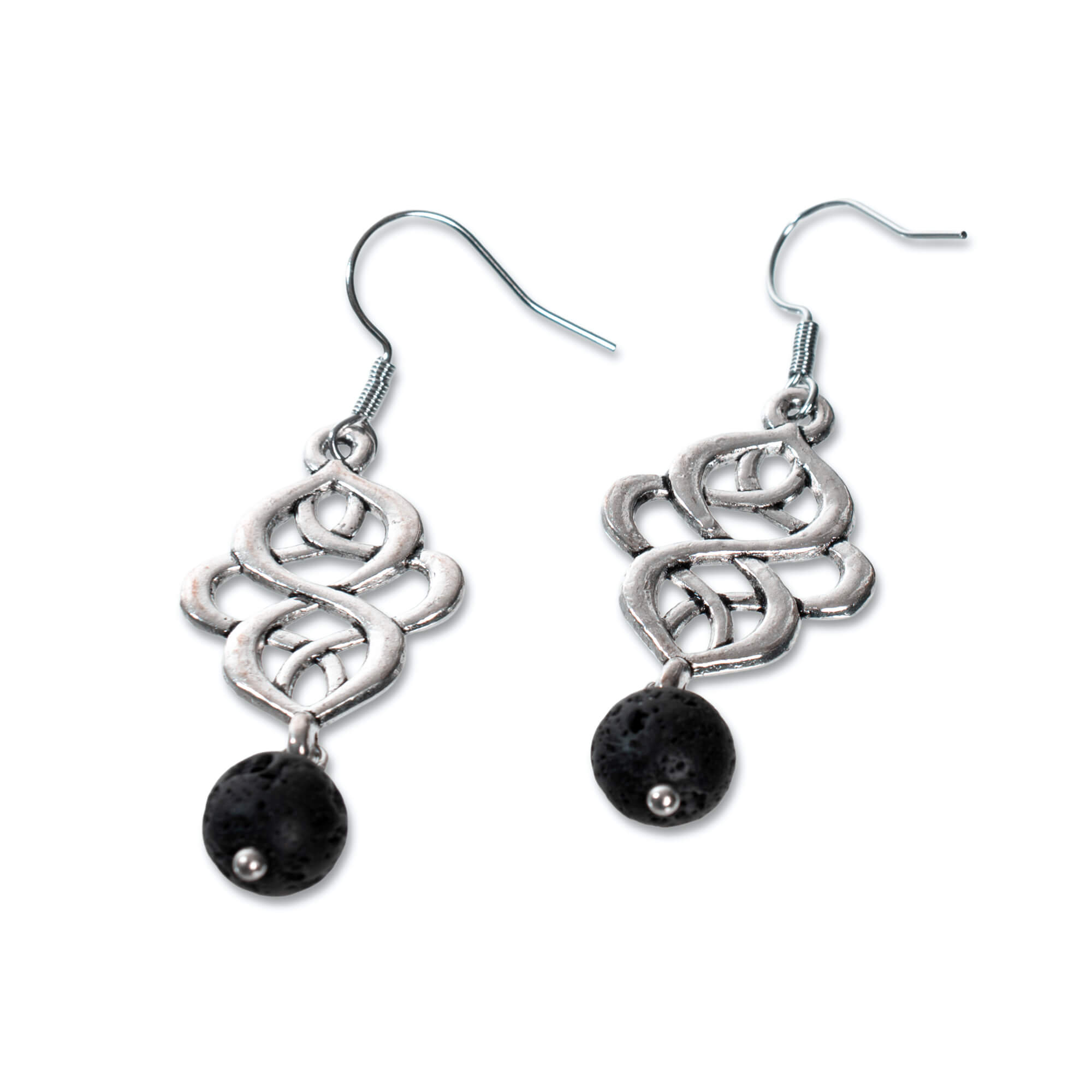 Etnostiilis antiikhõbedase metallelemendiga laavakivist kõrvarõngad. Niklivabad kõrvarõngakonksud. Võivad esineda värvivariatsioonid.
