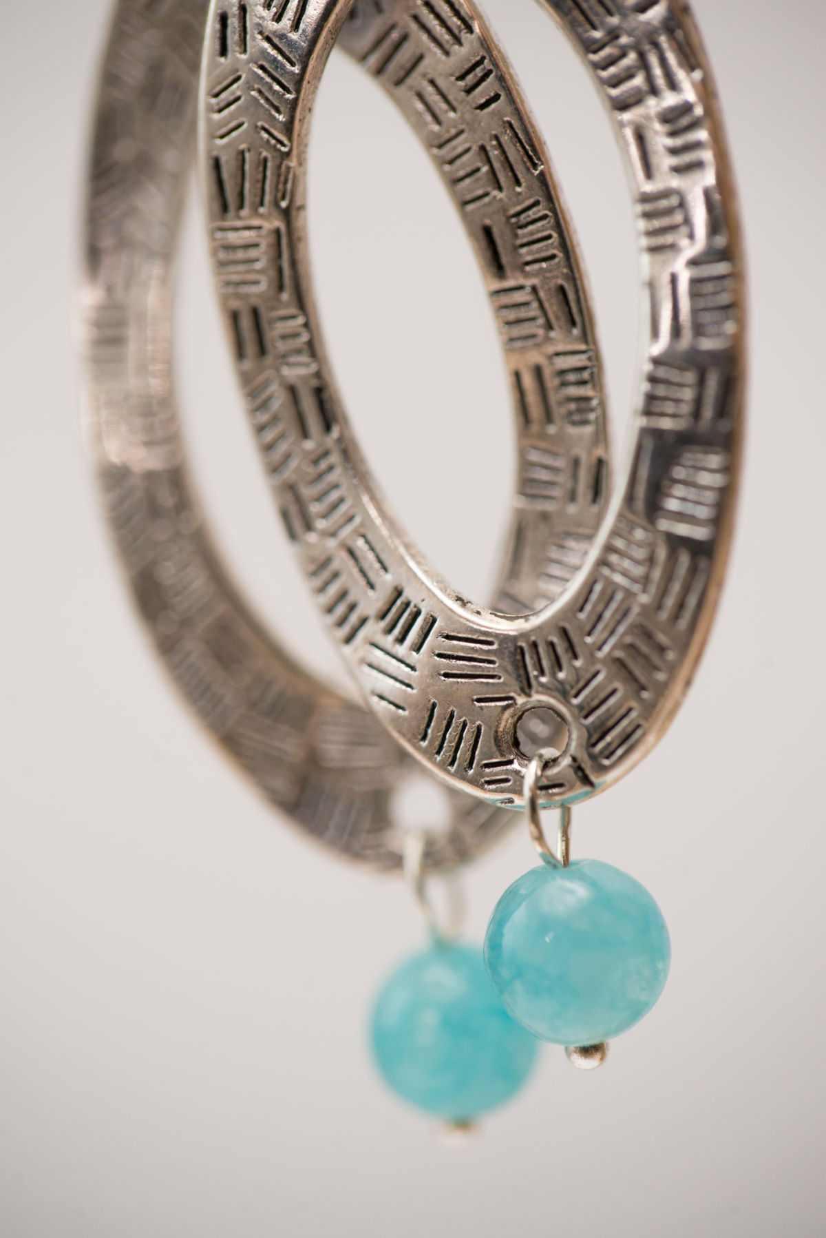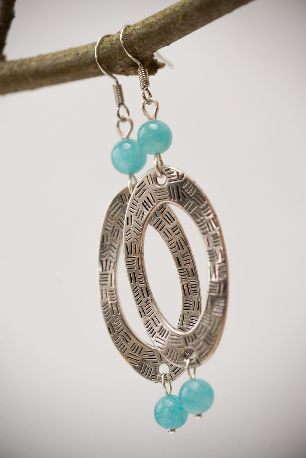 Etno stiilis antiikhõbedase ovaalse metallelemendiga akvamariinist kõrvarõngad.Niklivabad kõrvarõngakonksud. Võivad esineda värvivariatsioonid.